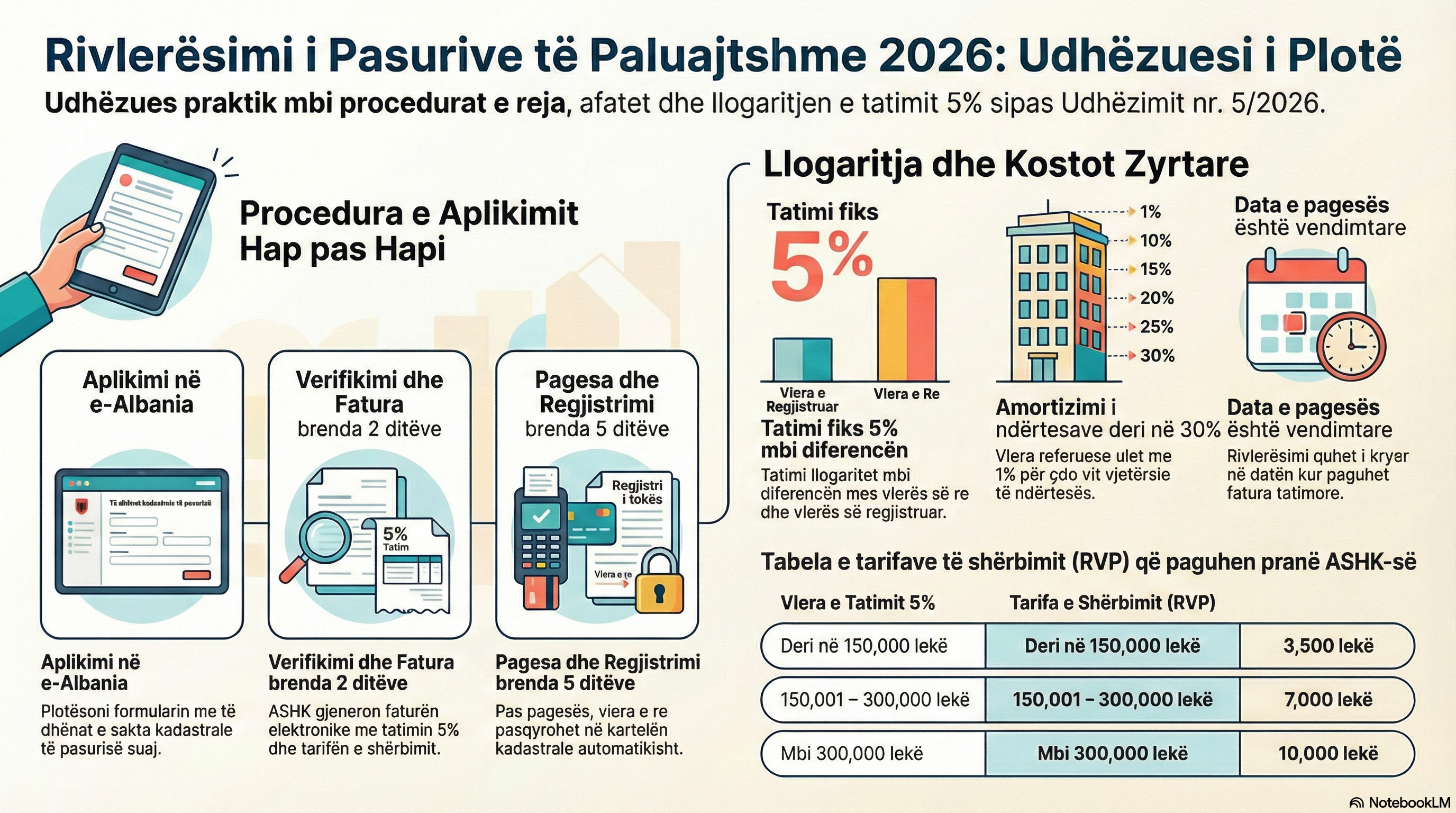 The service fee is paid separately from the 5% tax, and together they form the total administrative cost. If you have chosen a private expert, the cost of the expert’s report is added—currently ranging in the market between 30,000 and 100,000 ALL per property, depending on type and area.