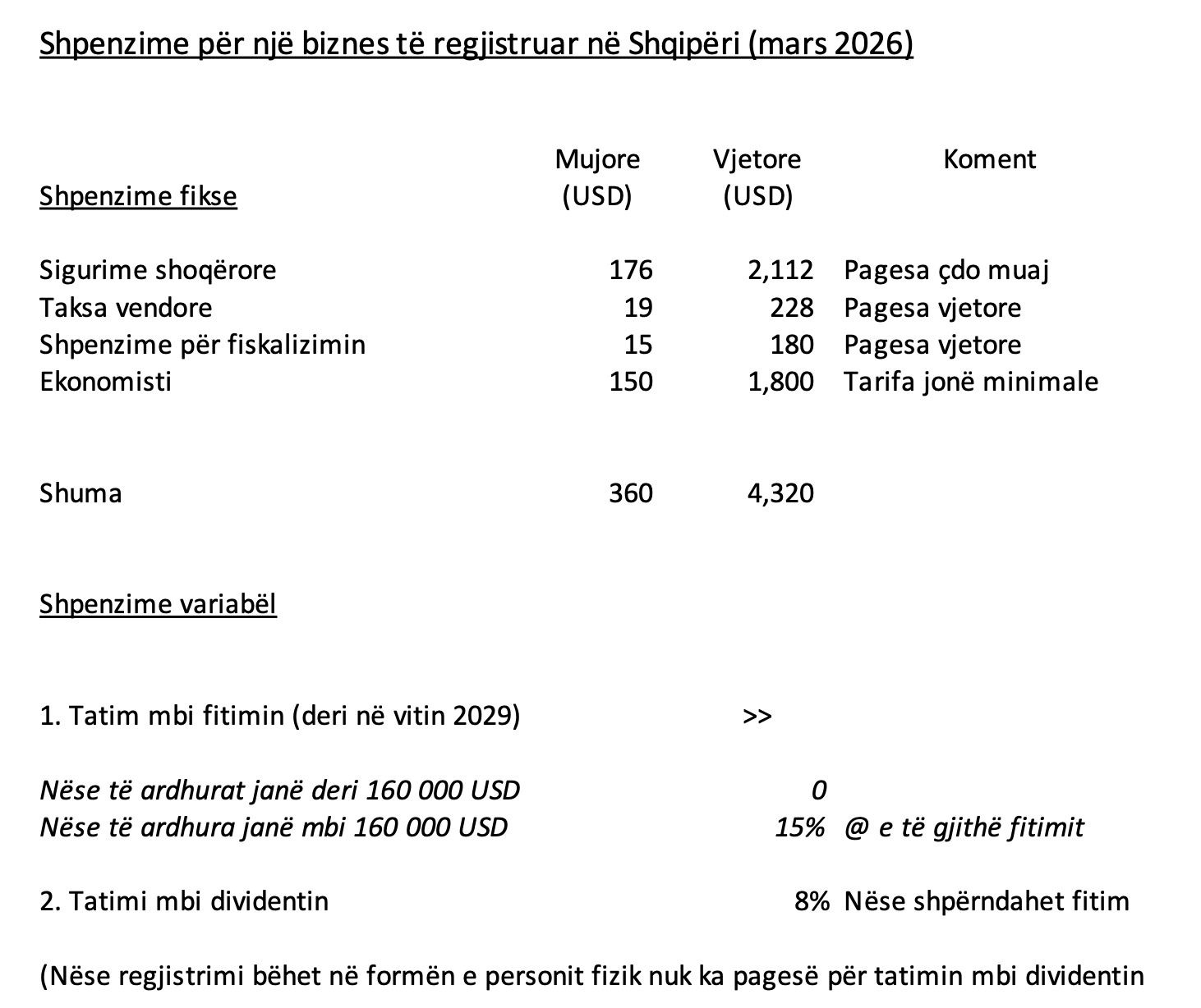 Shpenzimet variabël janë shumë të favorshme. Tatimi mbi fitimin është 0% deri në 14 milionë lekë të ardhura bruto, siç u shpjegua. Tatimi mbi dividentin prej 8% aplikohet vetëm nëse shpërndani fitim nga llogaria e biznesit tek llogaria juaj personale.